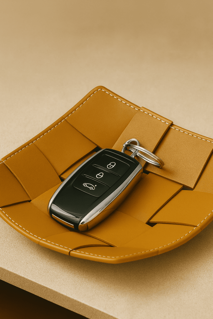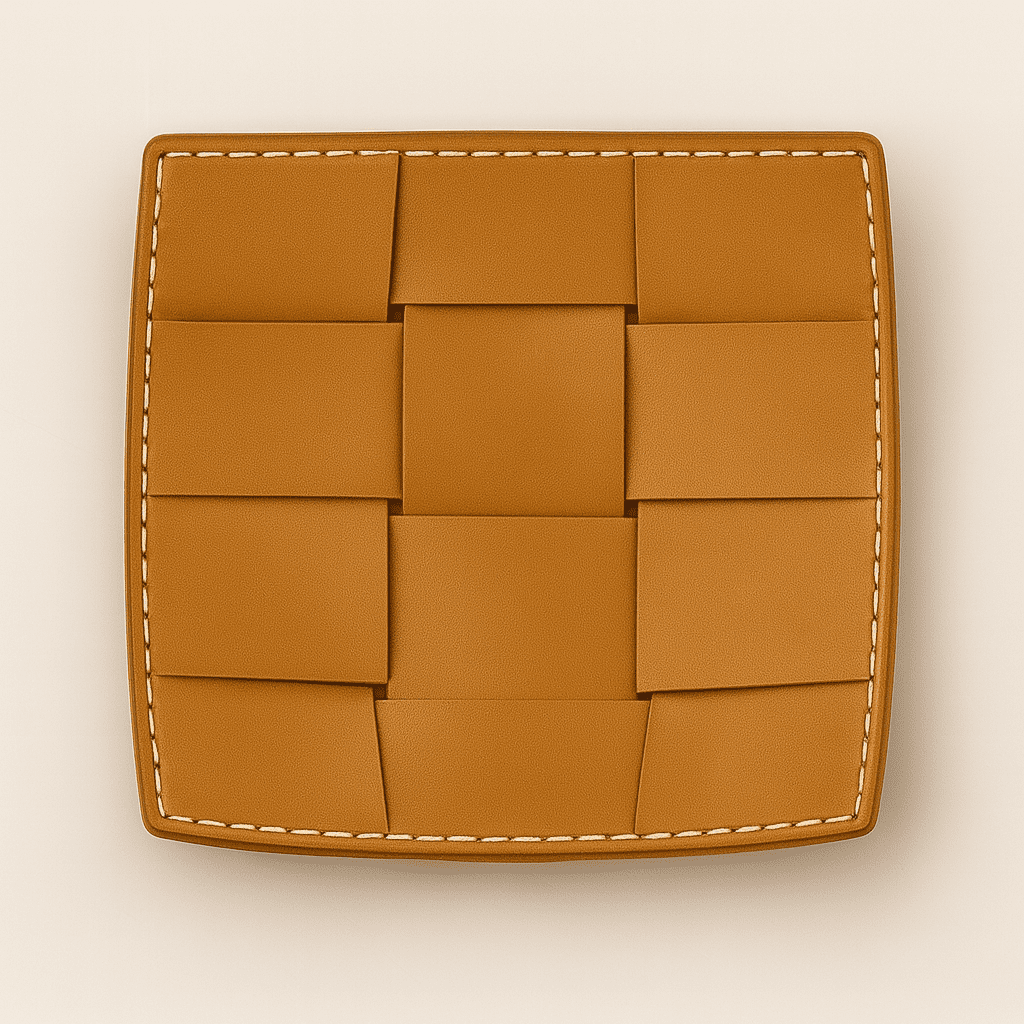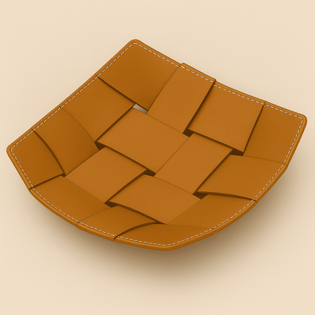 A handwoven leather tray that brings structure, texture, and quiet luxury to any surface.