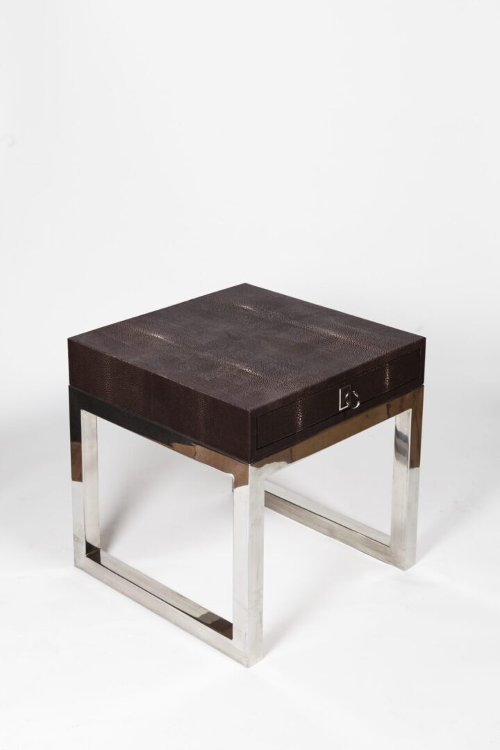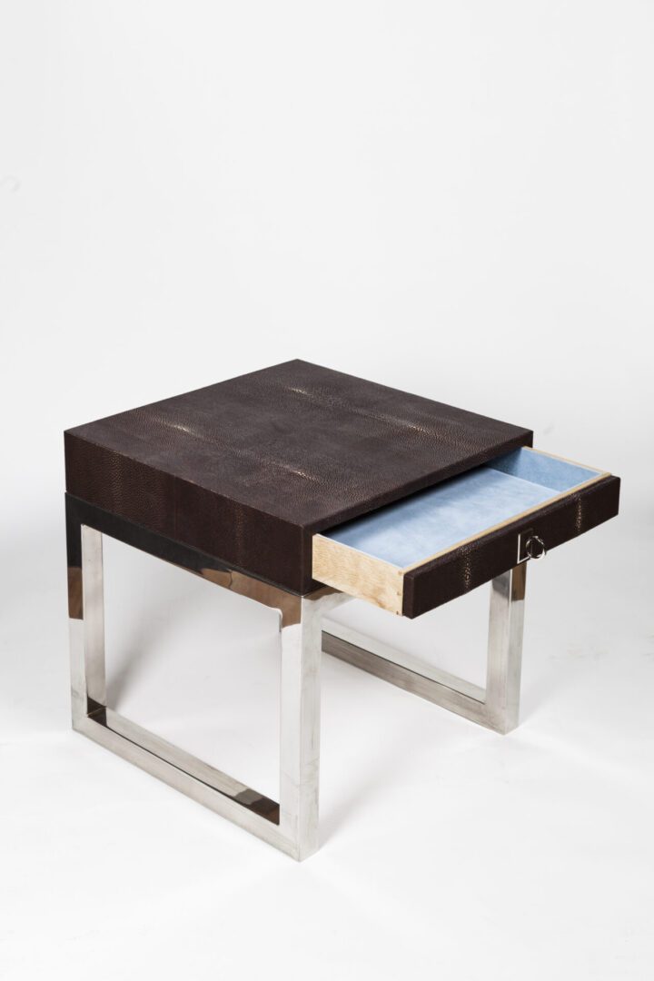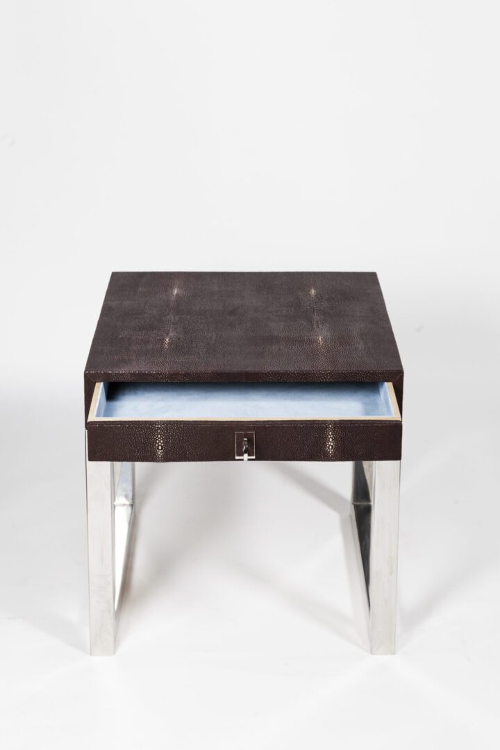 The Lujo Shagreen Side Table brings together rare materials and refined detailing. Crafted from wood and fully clad in genuine shagreen leather, its surface offers a subtle, organic texture that catches the light beautifully. A discreet drawer, lined in plush suede, provides elegant storage, while the polished stainless-steel legs give a modern edge to the piece’s classic form. Perfect as a bedside companion or a statement accent in a living space, Lujo embodies quiet sophistication with a tactile, luxurious presence.