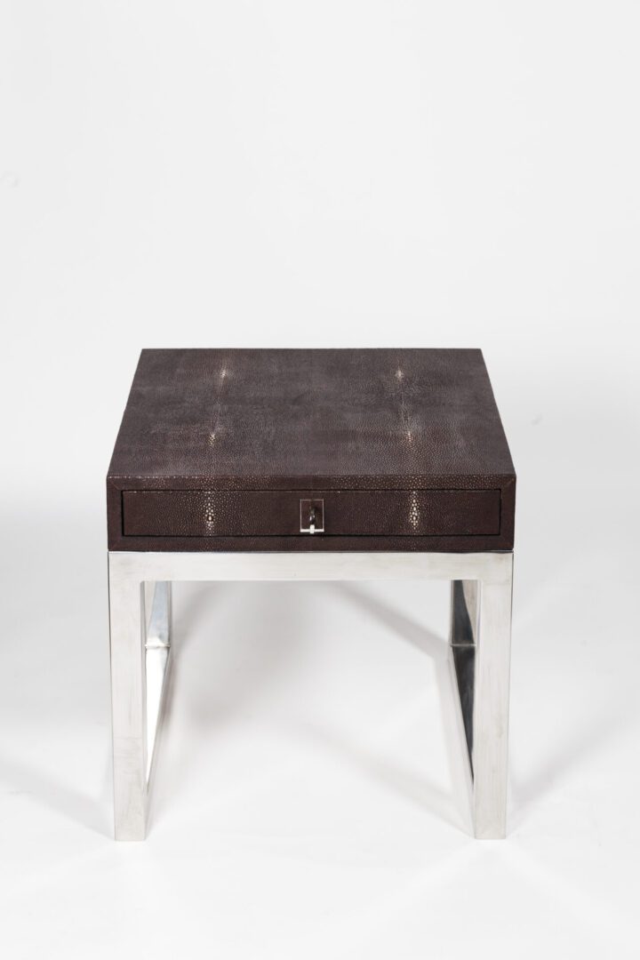 The Lujo Side Table pairs genuine shagreen leather with suede lined storage and sleek stainless steel legs.