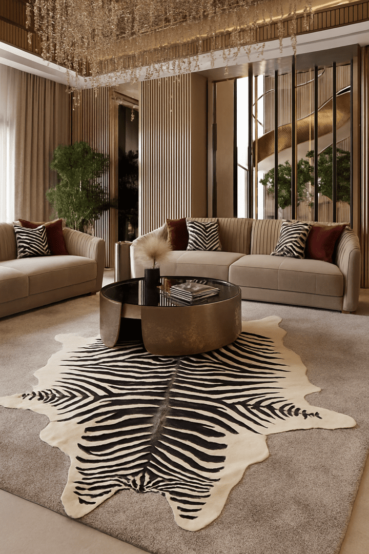 Our zebra-print cowhide rug transforms any space into a bold design statement. Made from premium hair-on hides, it combines the natural texture of cowhide with the dramatic pattern of zebra striping, offering a sophisticated balance of the exotic and the elegant. Each rug is unique in character, with subtle variations in grain and tone that enhance its individuality. Perfect as a focal point in modern living rooms, layered under furniture or styled as an accent piece, this rug infuses interiors with both luxury and daring personality.
