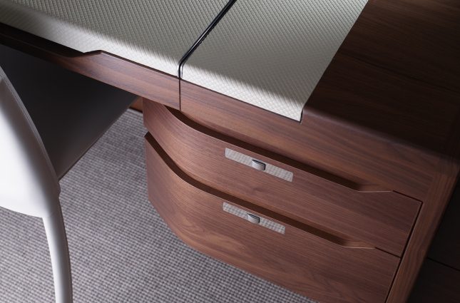 The writing desktops are especially striking since they are covered in embossed leather, giving a useful component texture and a custom touch. Leather panelling on the back walls of the bed created a sophisticated yet cosy background. Additionally, we added delicate stitching details to the cabinet shutters, turning a basic design element into a focal point.